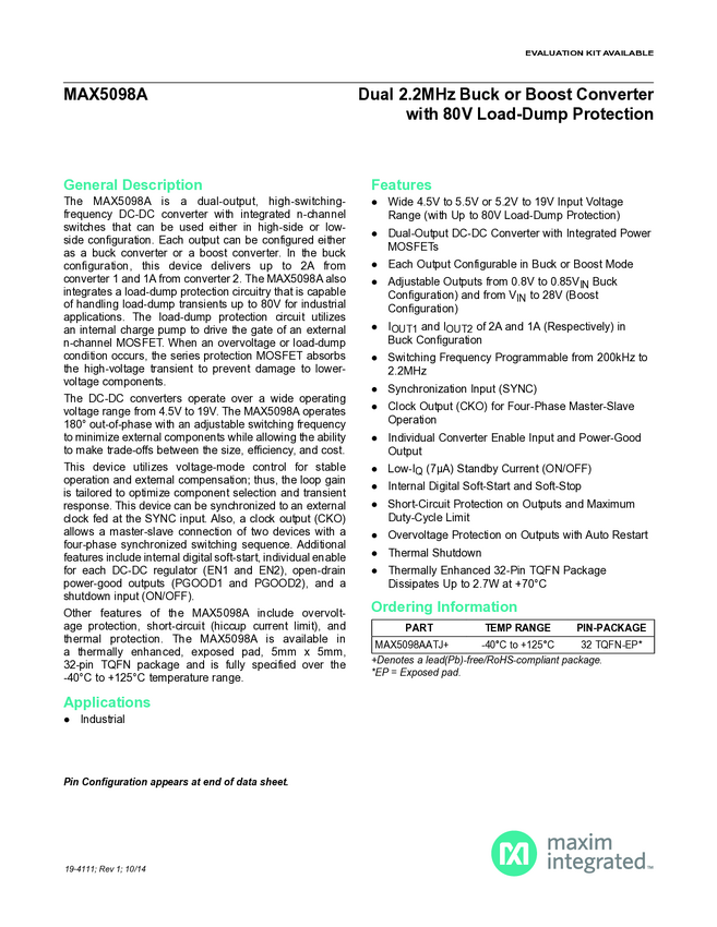 MAX5098A Dual, 2.2MHz, Buck or Boost Converter with 80V Load-Dump Protection