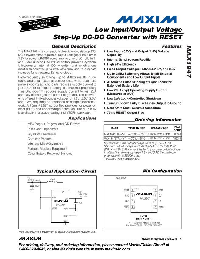 MAX1947 Low Input/Output Voltage Step-Up DC-DC Converter with Active-Low RESET
