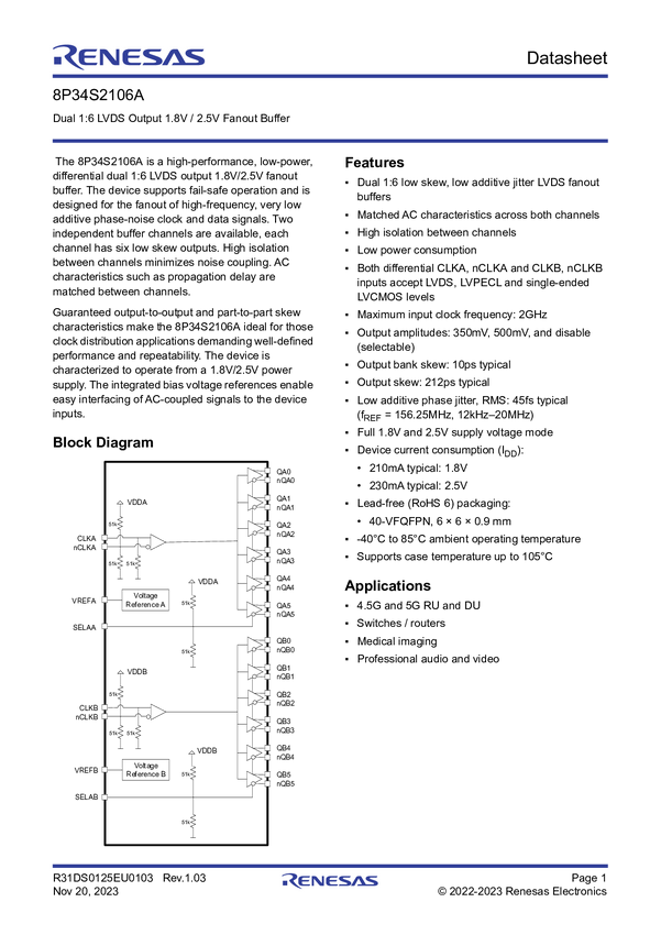 8P34S2106A Dual 1:6 LVDS Output 1.8V/2.5V Fanout Buffer