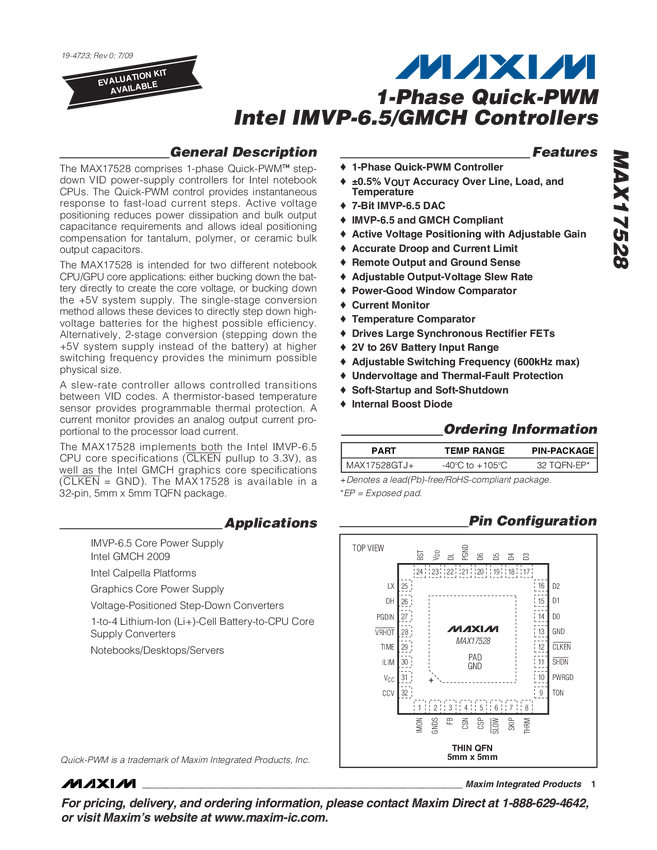 MAX17528 1-Phase, Quick-PWM Intel IMVP-6.5/GMCH Controllers