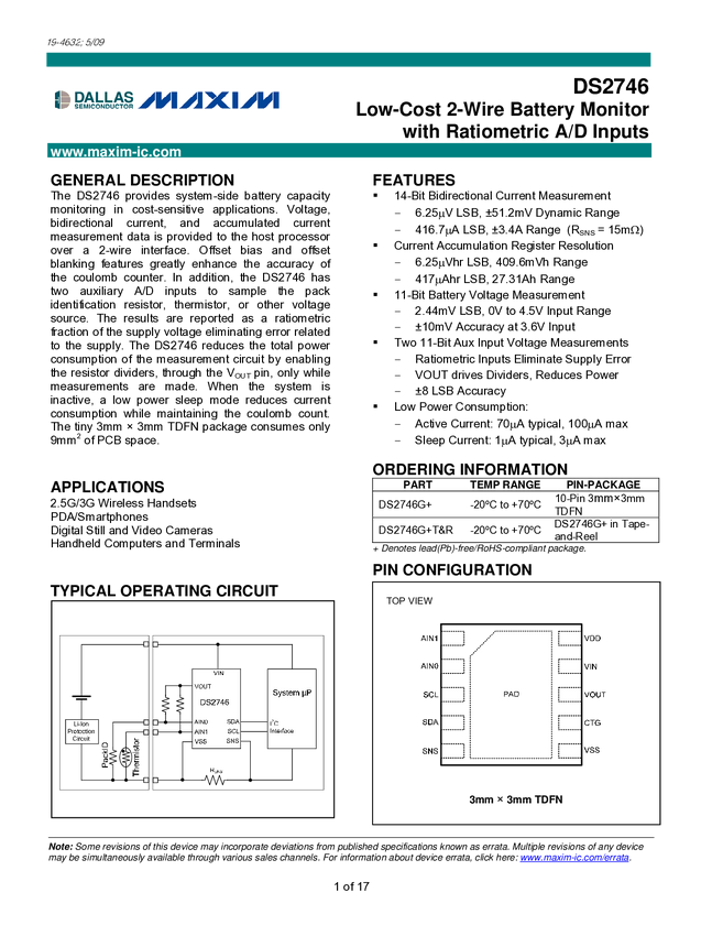 DS2746 Low-Cost, 2-Wire Battery Monitor with Ratiometric A/D Inputs