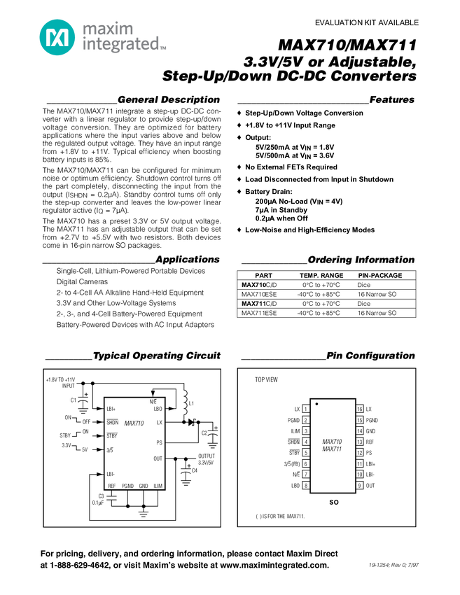 MAX711 3.3V/5V or Adjustable, Step-Up Step-Down DC-DC Converters