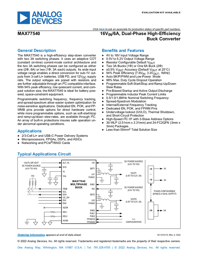 MAX77540 16V/6A, Dual-Phase High-Efficiency Buck Converter