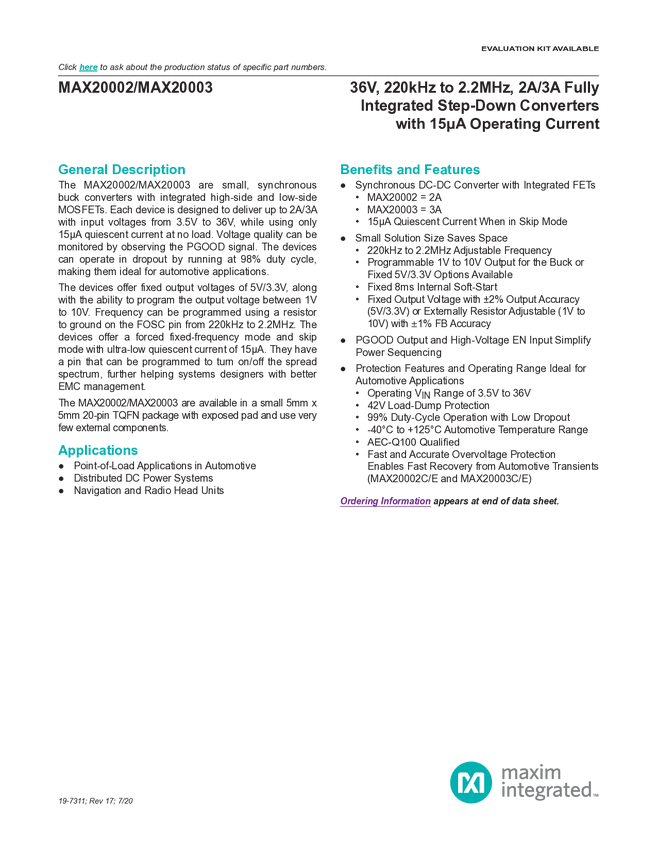 MAX20003 36V, 220kHz to 2.2MHz, 2A/3A Fully Integrated Step-Down Converters with 15µ...