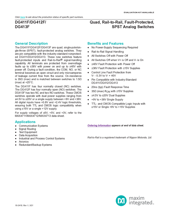 DG411F Quad, Rail-to-Rail, Fault-Protected, SPST Analog Switches