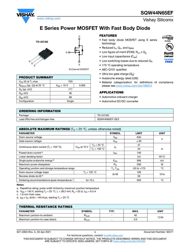 SQW44N65EF E Series Power MOSFET With Fast Body Diode