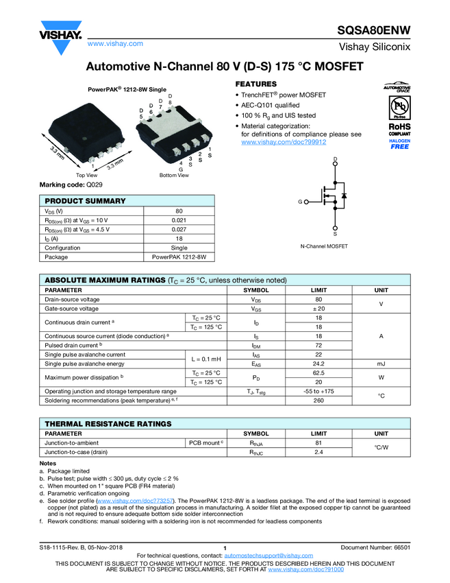 Automotive N-Channel 80 V (D-S) 175 °C MOSFET