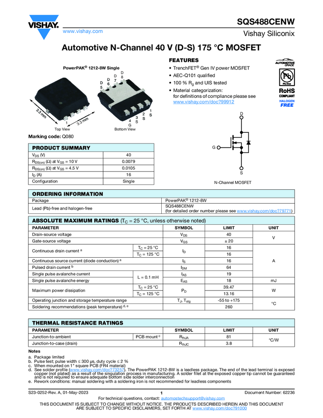 SQS488CENW Automotive N-Channel 40 V (D-S) 175 °C MOSFET