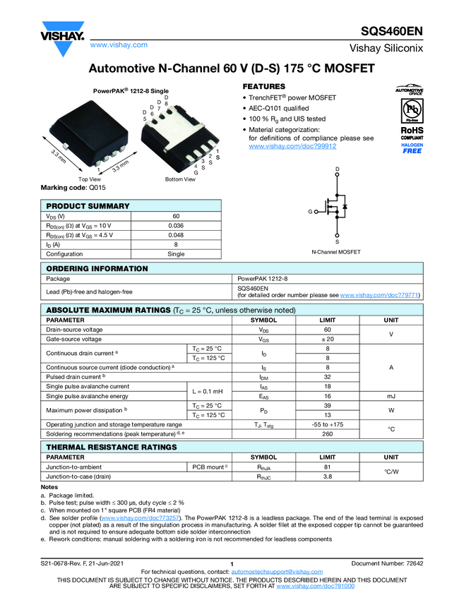 SQS460EN Automotive N-Channel 60 V (D-S) 175 °C MOSFET