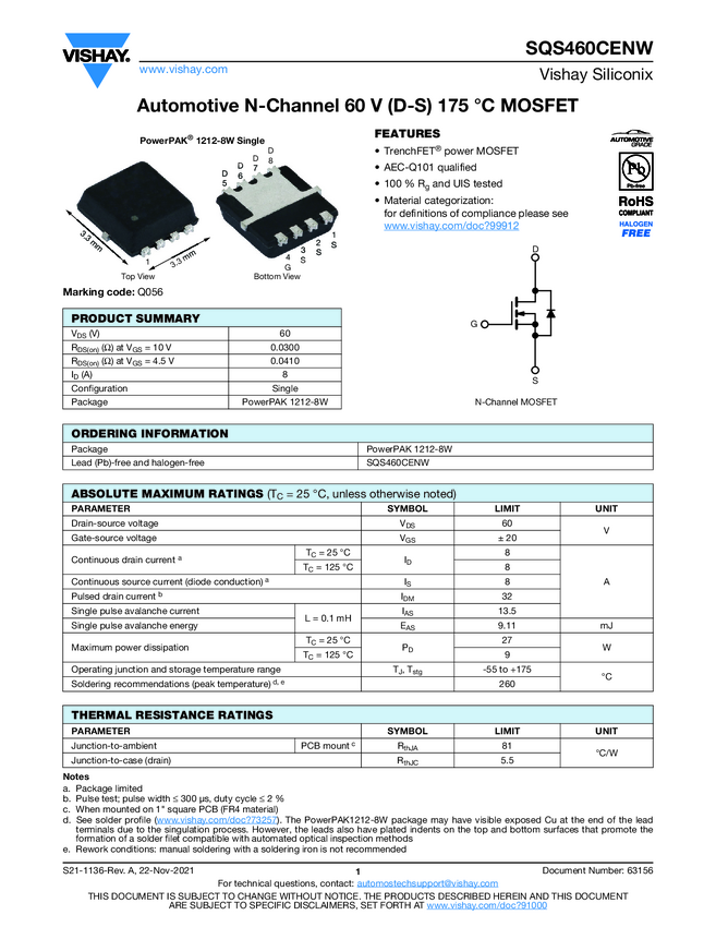 SQS460CENW Automotive N-Channel 60 V (D-S) 175 °C MOSFET