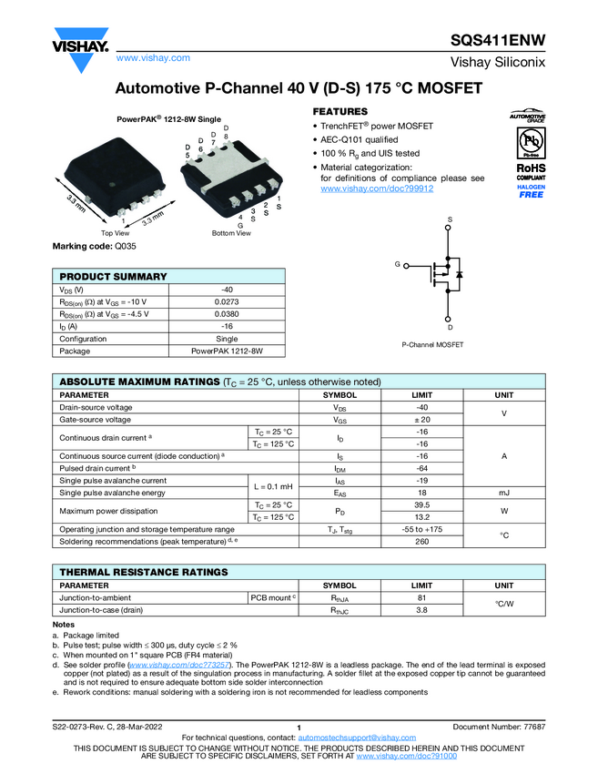 SQS411ENW Automotive P-Channel 40 V (D-S) 175 °C MOSFET