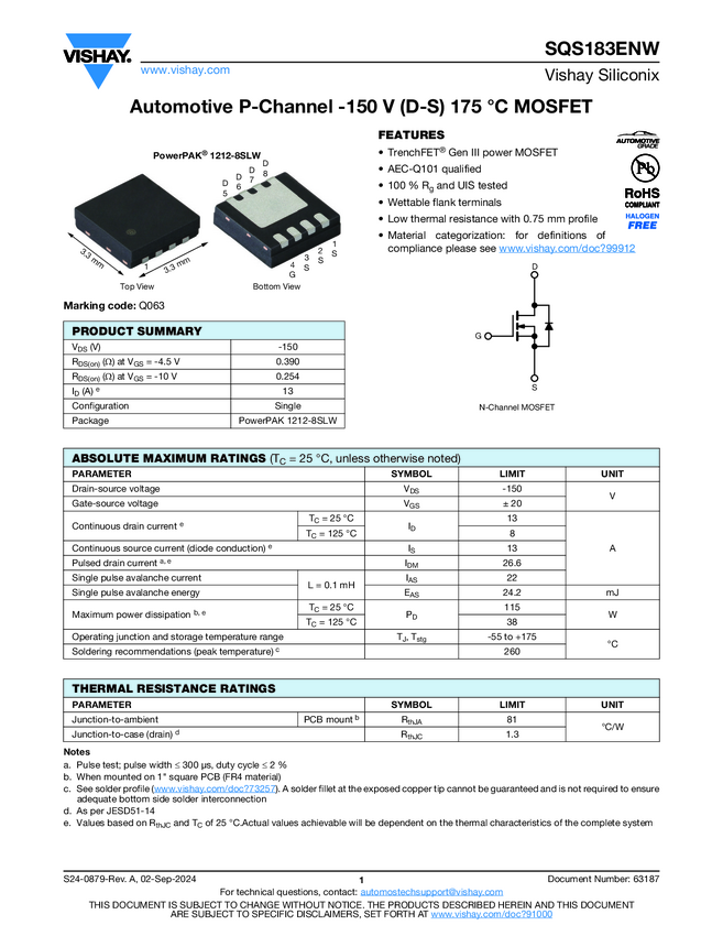 SQS183ENW Automotive P-Channel -150 V (D-S) 175 °C MOSFET