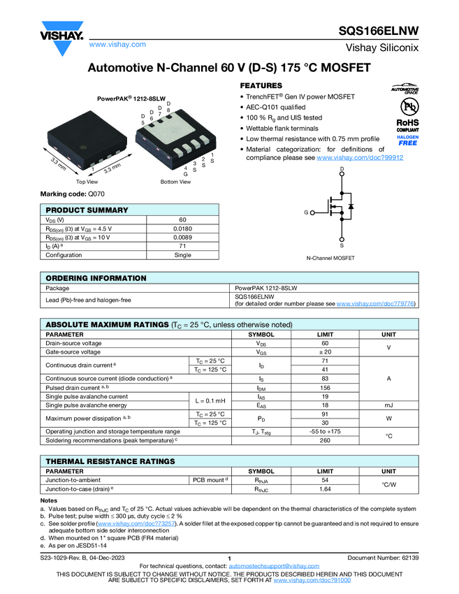 SQS166ELNW Automotive N-Channel 60 V (D-S) 175 °C MOSFET