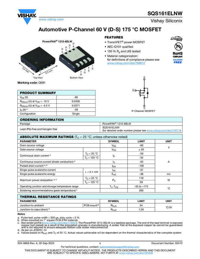 SQS161ELNW Automotive P-Channel 60 V (D-S) 175 °C MOSFET