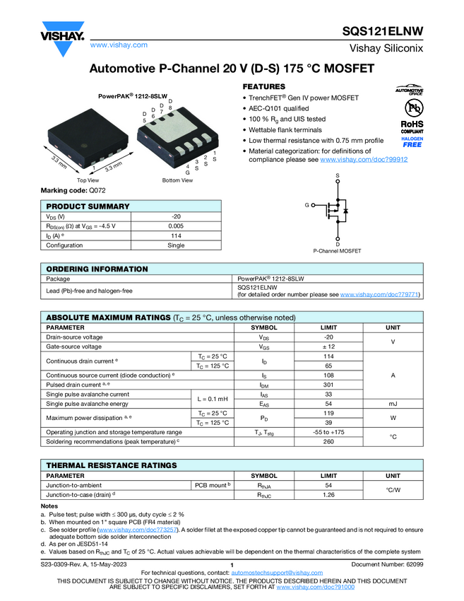 SQS121ELNW Automotive P-Channel 20 V (D-S) 175 °C MOSFET