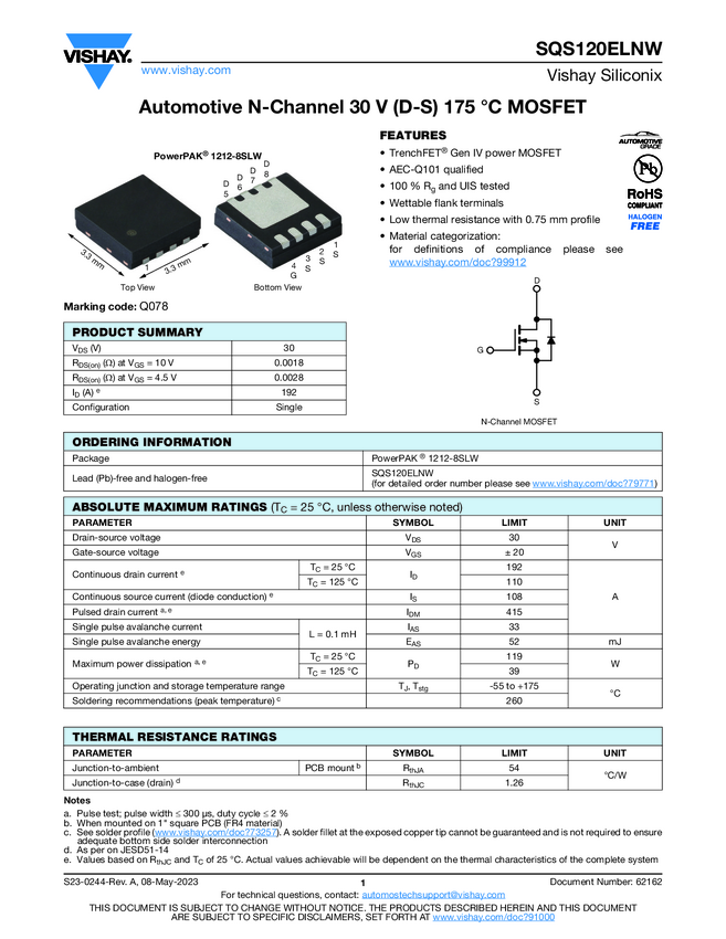 SQS120ELNW Automotive N-Channel 30 V (D-S) 175 °C MOSFET