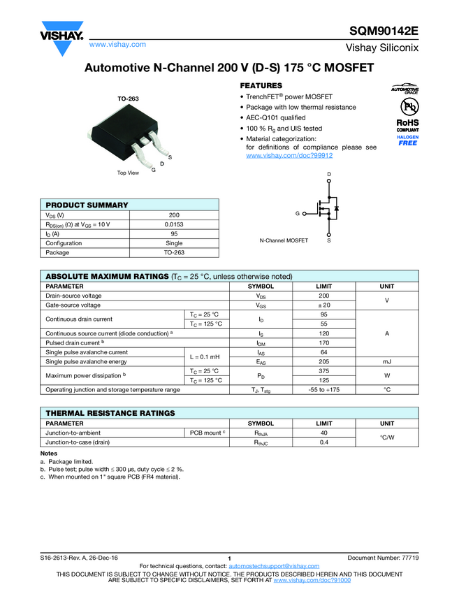 SQM90142E Automotive N-Channel 200 V (D-S) 175 °C MOSFET