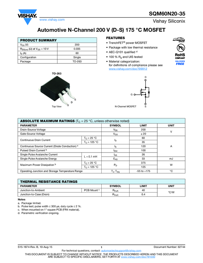 SQM60N20-35 Automotive N-Channel 200 V (D-S) 175 °C MOSFET