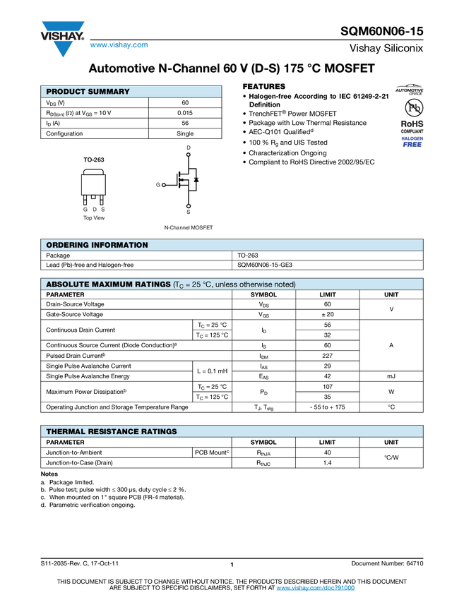 SQM60N06-15 Automotive N-Channel 60 V (D-S) 175 °C MOSFET