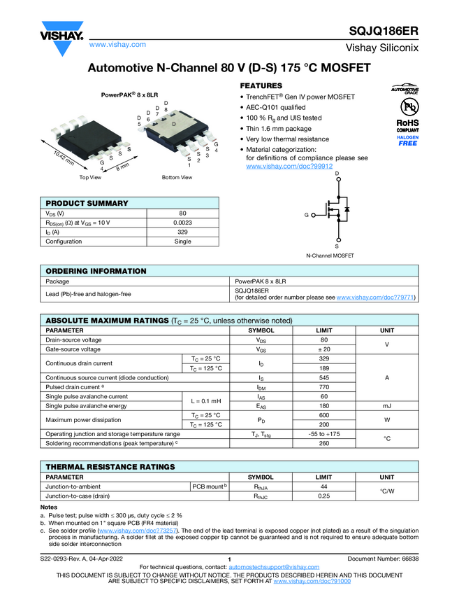 SQJQ186ER Automotive N-Channel 80 V (D-S) 175 °C MOSFET