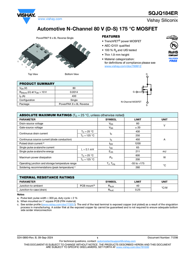 SQJQ184ER Automotive N-Channel 80 V (D-S) 175 °C MOSFET