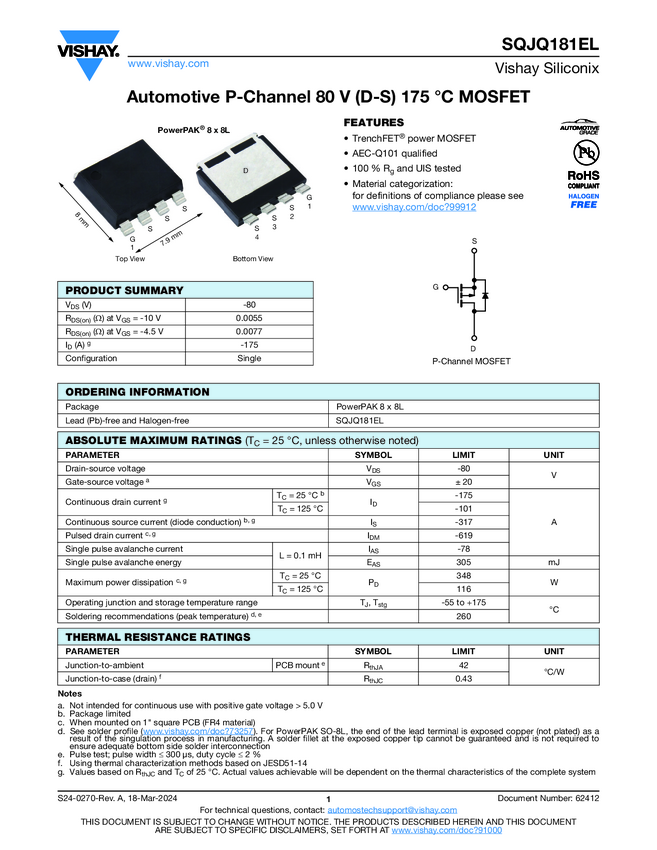 SQJQ181EL Automotive P-Channel 80 V (D-S) 175 °C MOSFET