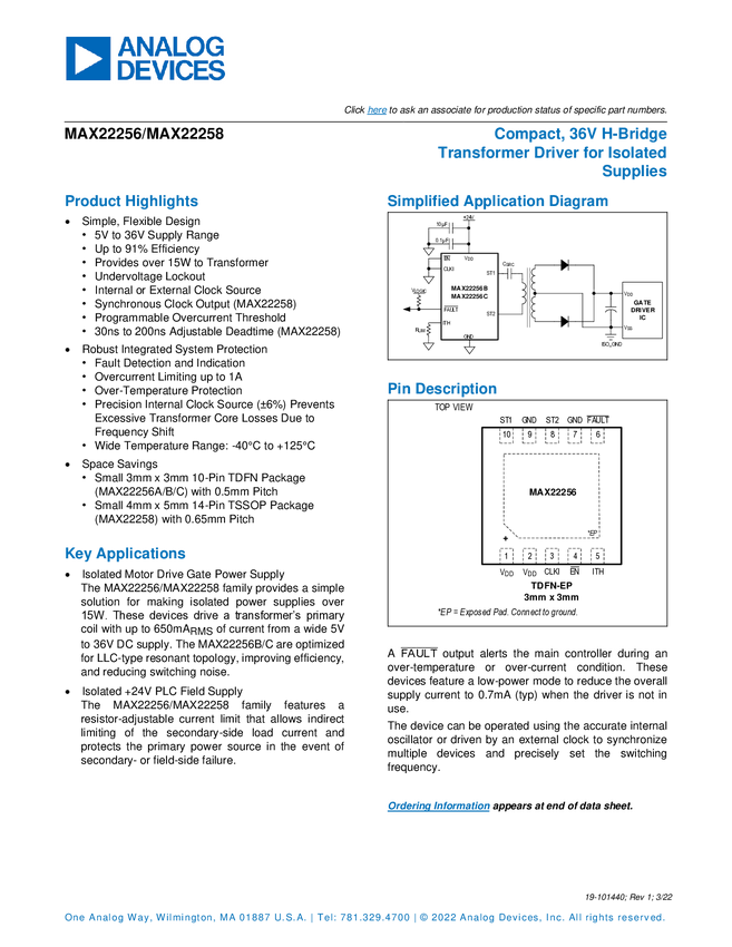 MAX22258 Compact, 36V H-Bridge Transformer Driver for Isolated Supplies