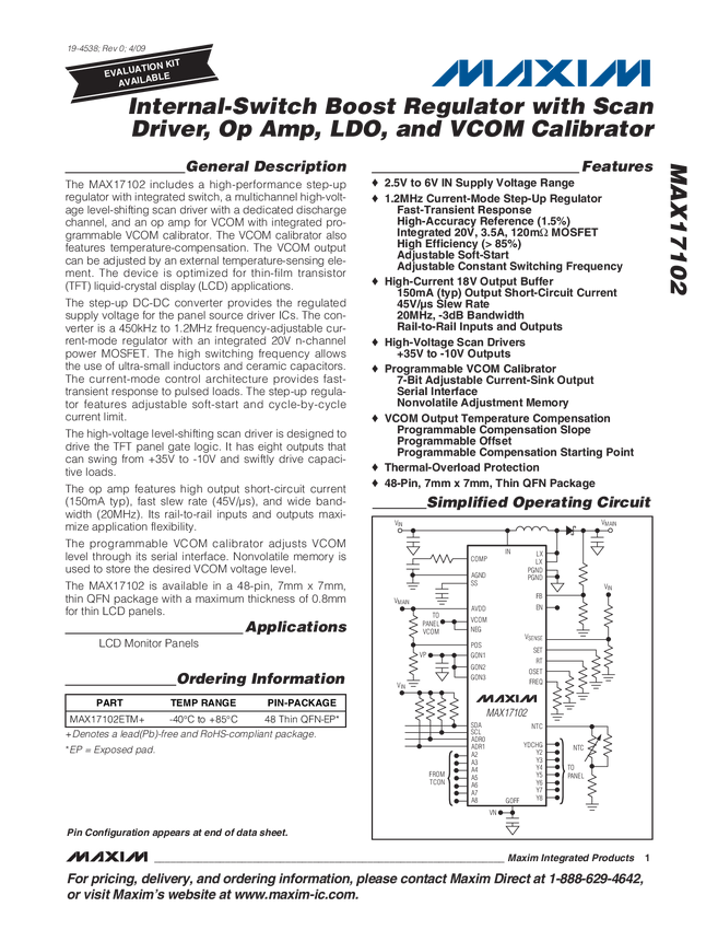 MAX17102 Internal-Switch Boost Regulator with Scan Driver, Op Amp, LDO, and VCOM Cal...
