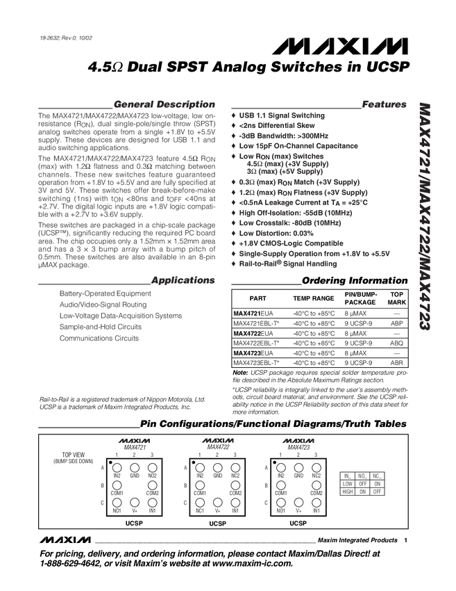 MAX4721 4.5Ω Dual SPST Analog Switches in UCSP