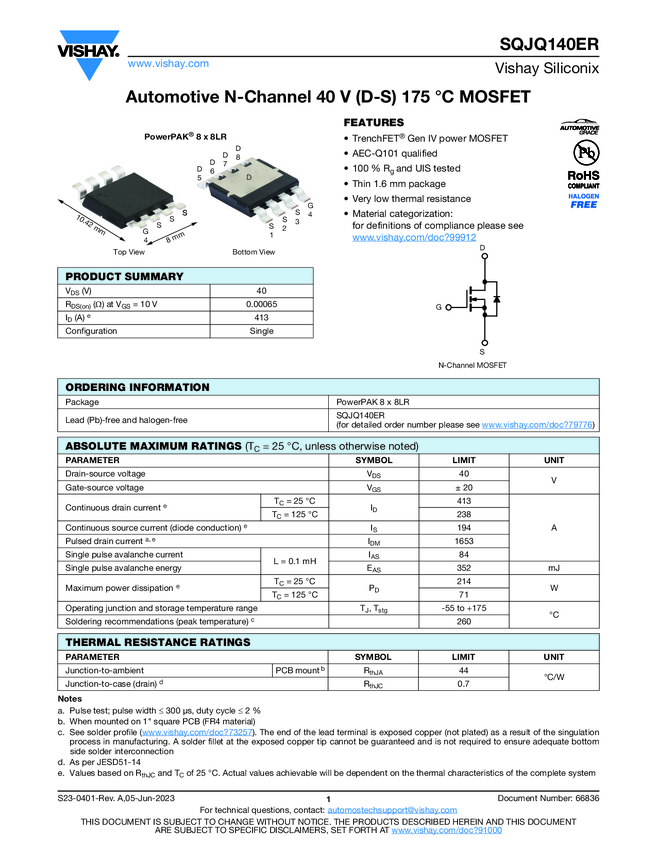 SQJQ140ER Automotive N-Channel 40 V (D-S) 175 °C MOSFET