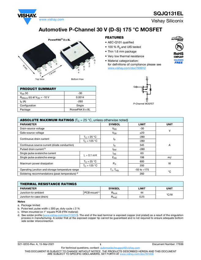 SQJQ131EL Automotive P-Channel 30 V (D-S) 175 °C MOSFET