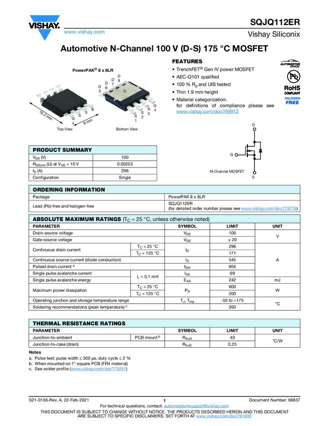 SQJQ112ER Automotive N-Channel 100 V (D-S) 175 °C MOSFET