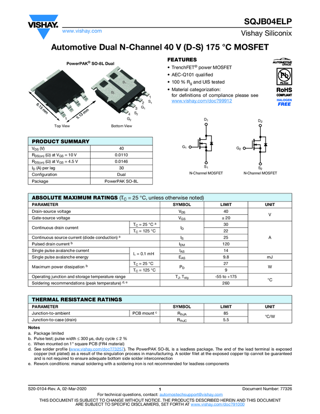 SQJB04ELP Automotive Dual N-Channel 40 V (D-S) 175 °C MOSFET