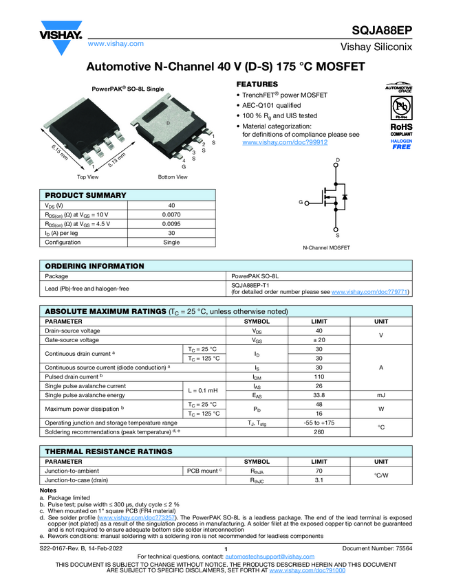 SQJA88EP Automotive N-Channel 40 V (D-S) 175 °C MOSFET