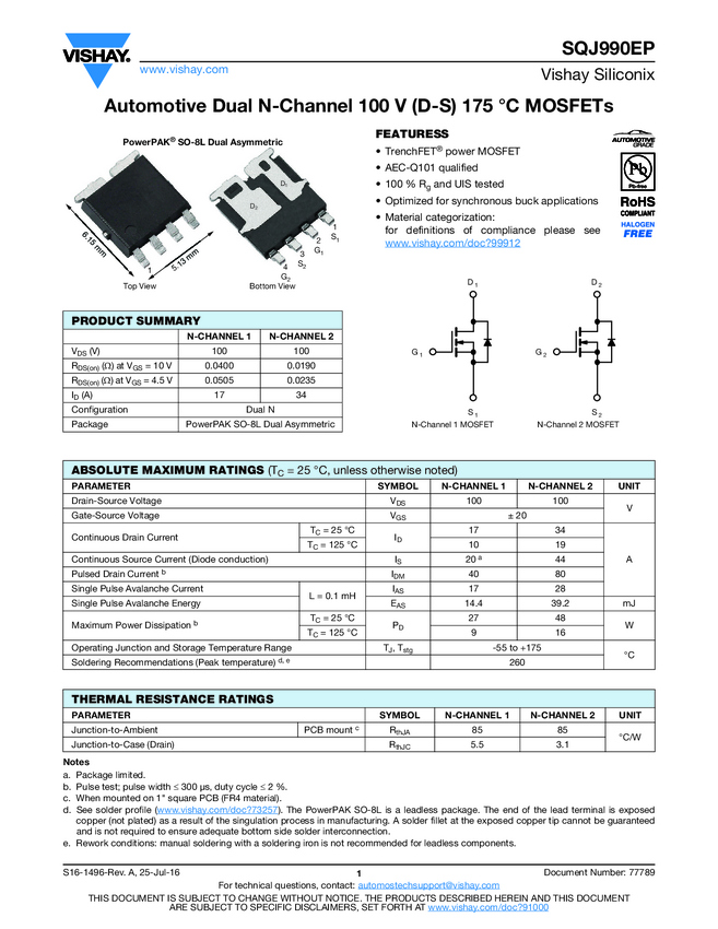 SQJ990EP Automotive Dual N-Channel 100 V (D-S) 175 °C MOSFETs