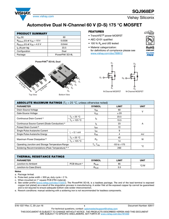 SQJ968EP Automotive Dual N-Channel 60 V (D-S) 175 °C MOSFET