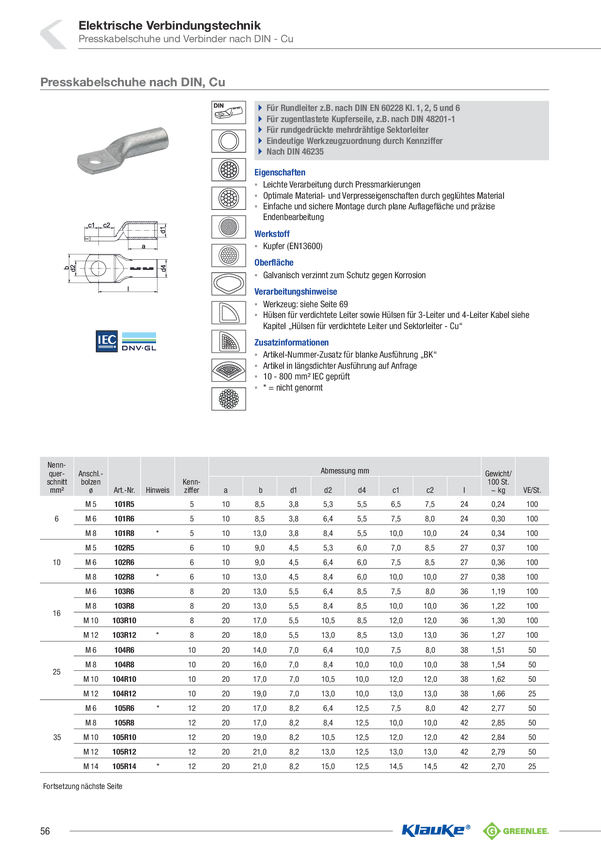 109R10 Klauke 109R10 Końcówka kablowa, rurkowa Zubehör Kabel, M10, 120 mm², 180 °,...