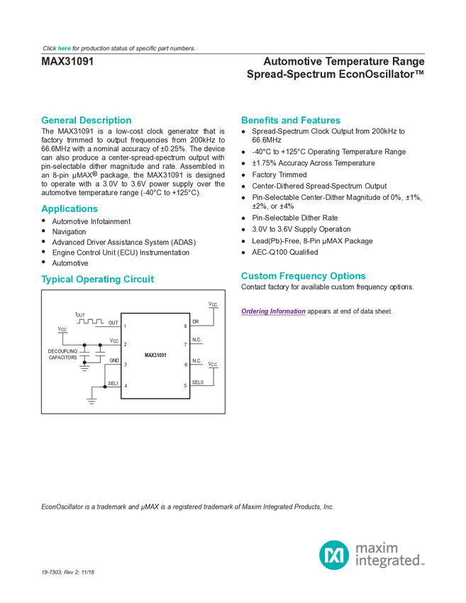 MAX31091 Automotive Temperature Range Spread-Spectrum EconOscillator