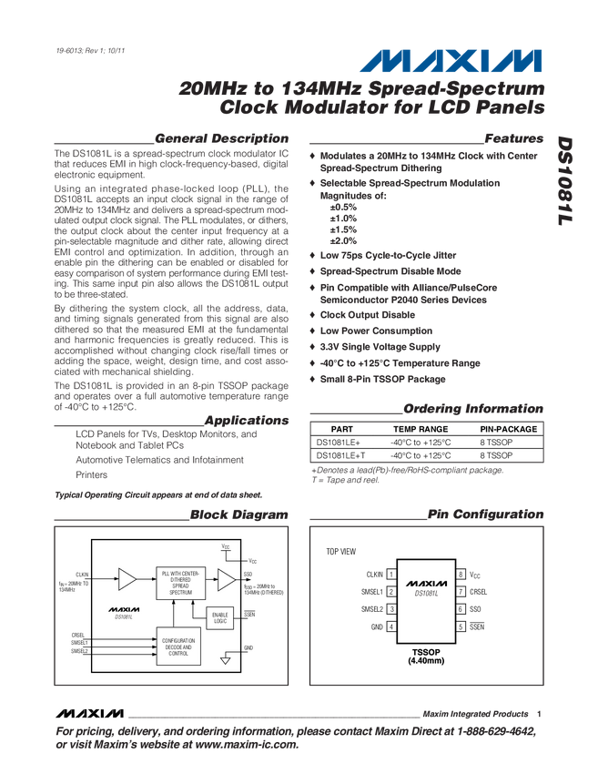 DS1081L Spread-Spectrum Clock Modulator for LCD Panels