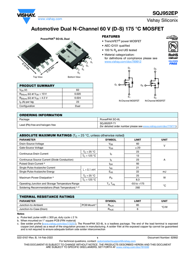 SQJ952EP Automotive Dual N-Channel 60 V (D-S) 175 °C MOSFET