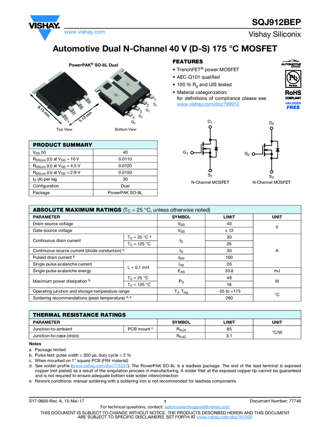 SQJ912BEP Automotive Dual N-Channel 40 V (D-S) 175 °C MOSFET