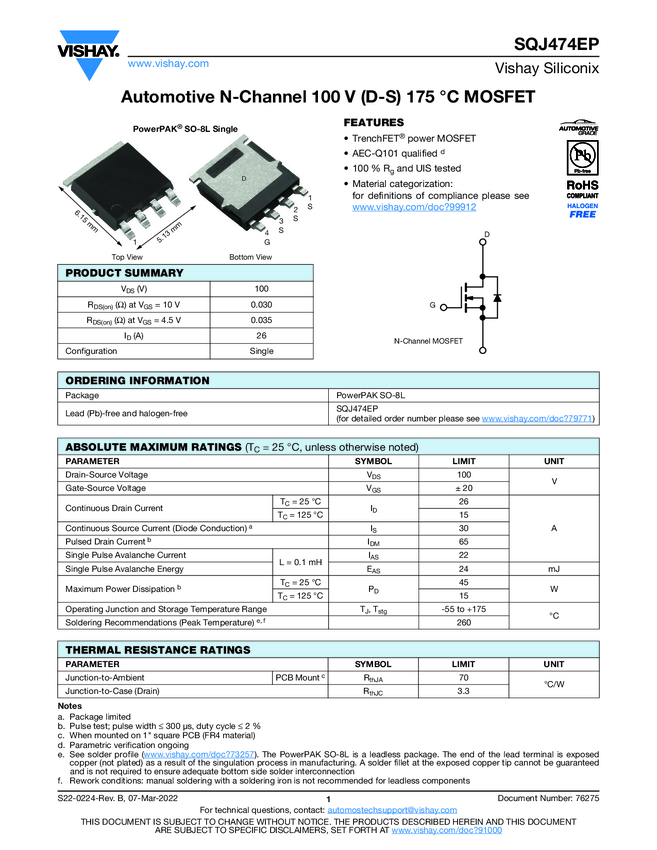 SQJ474EP Automotive N-Channel 100 V (D-S) 175 °C MOSFET