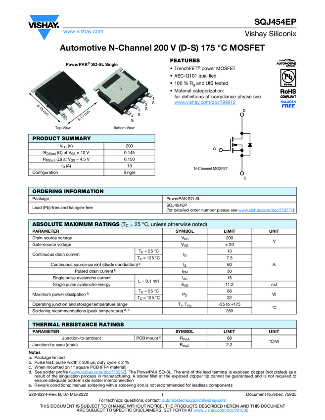 SQJ454EP Automotive N-Channel 200 V (D-S) 175 °C MOSFET