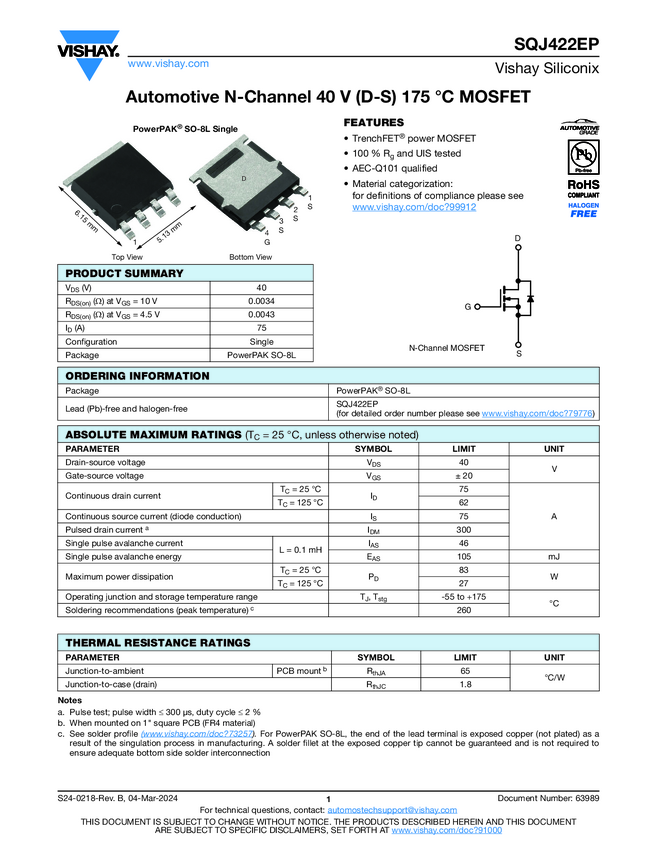 SQJ422EP Automotive N-Channel 40 V (D-S) 175 °C MOSFET