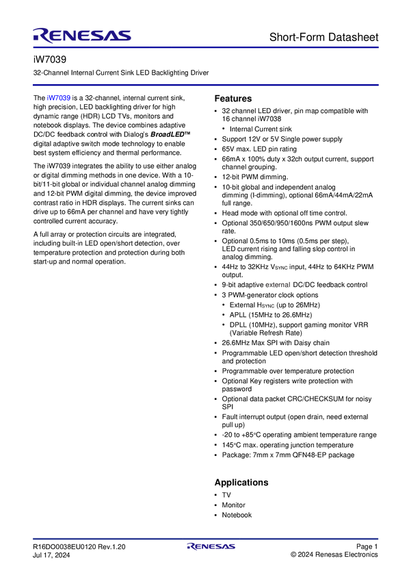 iW7039 High Precision, 32-Channel LED Backlighting Driver with Integrated Current...