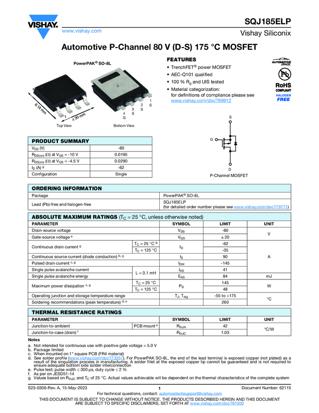 SQJ185ELP Automotive P-Channel 80 V (D-S) 175 °C MOSFET