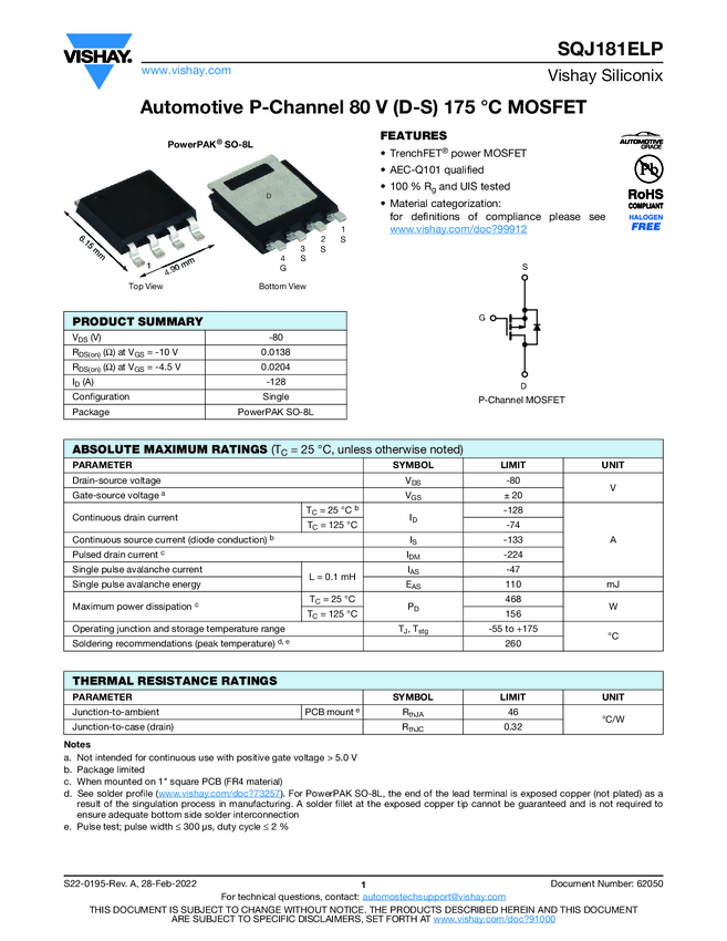SQJ181ELP Automotive P-Channel 80 V (D-S) 175 °C MOSFET