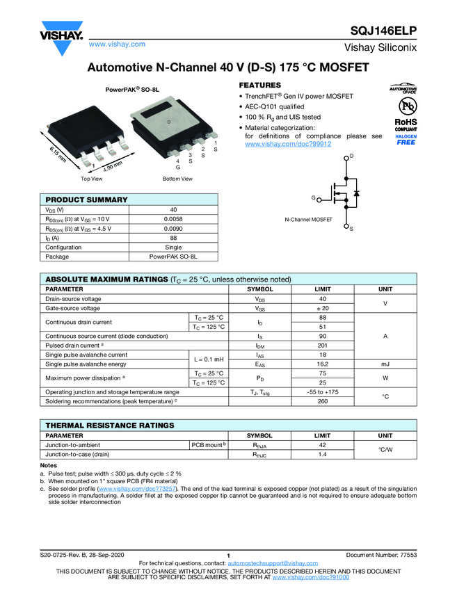 SQJ146ELP Automotive N-Channel 40 V (D-S) 175 °C MOSFET