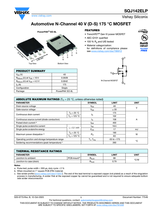 SQJ142ELP Automotive N-Channel 40 V (D-S) 175 °C MOSFET
