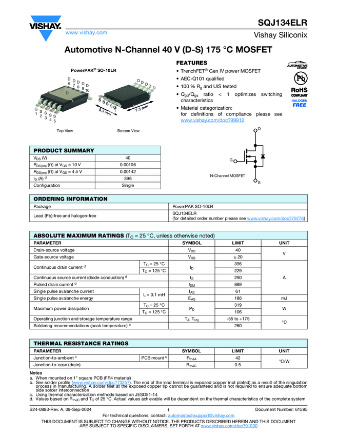 SQJ134ELR Automotive N-Channel 40 V (D-S) 175 °C MOSFET